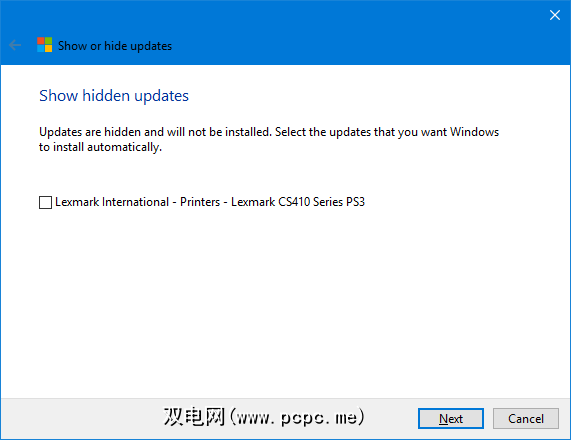 要还原更新,请从相应屏幕中选择显示隐藏的更新 ,选择隐藏的更新,然后单击下一步。