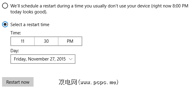 手动触发更新的安装(从设置>更新和安全性> Windows Update )时,可以让Windows 安排在通常不使用设备的时间内重新启动,或者您自己选择重新启动时间。您最多可以计划在未来6天进行重启。当然,您也可以单击立即重新启动立即进行操作。