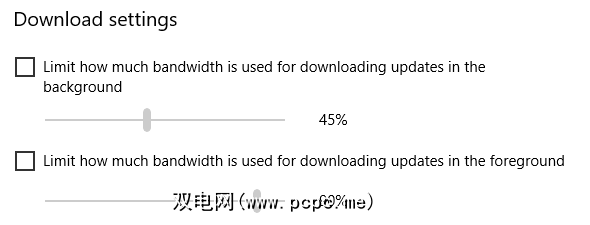 如果您想节省更多带宽,请单击高级选项"。在这里,您会找到一些选项,用于限制Windows在下载或上传更新时可以使用的带宽。虽然您可以设置每月上传限制(与其他PC共享更新时),但Windows不允许您设置下载限制。如果您使用默认设置,则Windows将动态优化分配给Windows Update的带宽。