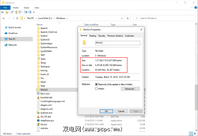 导航到 C:\ Windows \ WinSxS ,右键单击它并选择 Properties 强>。该文件夹消耗了将近7.3GB的磁盘空间。但事实是,这不是真实尺寸。原因是文件资源管理器和其他第三方工具不考虑“硬链接"。