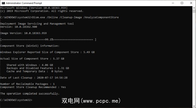 分析后,组件存储的实际大小减小了至5.37GB。此值将WinSxS文件夹中的硬链接包括在内。 与Windows共享可为您提供硬链接文件的大小。 最后清除日期是最近完成的组件存储清除的日期。