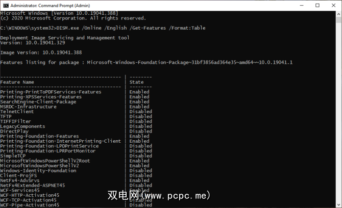 DISM.exe /Online /English /Get-Features /Format:Table您将看到功能名称及其状态的列表