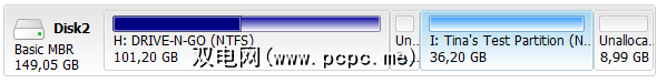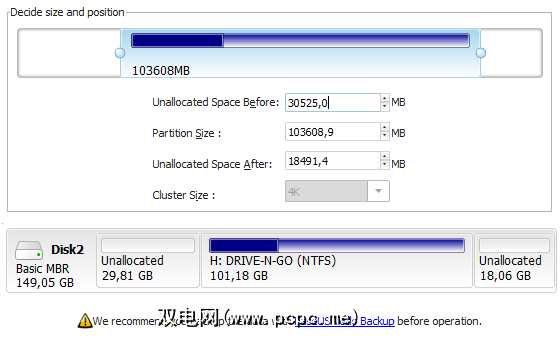 我不希望移动数据,因此我在现有分区的右侧创建了未分配的空间,单击确定。磁盘映射现在显示了我的外部硬盘驱动器的未分配空间。
