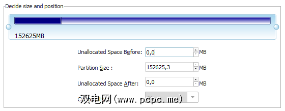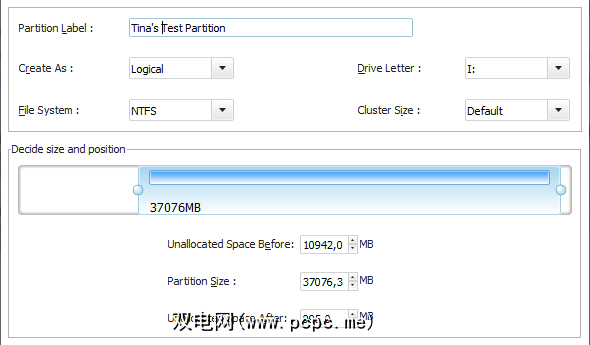 我可以选择未分配空间,然后单击 Operations 下或工具栏中的 Create 。创建一个新分区。将弹出一个窗口,您可以在其中选择分区标签,文件系统,驱动器号,群集大小以及应将多少未分配空间专用于新分区。再次,您可以拖动球形手柄以更改新分区的位置和大小。