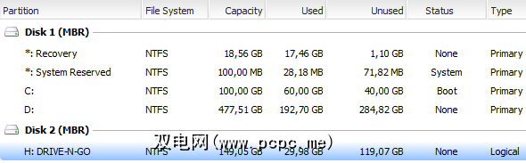正面和中央都是连接到计算机的磁盘。连接的驱动器列出为Disk1,Disk2等。在每个磁盘标题下,您将找到相应磁盘的所有分区及其属性。