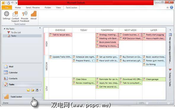 尝试使用TaskCracker for Outlook。如果您是一个有视觉见识的人,我们相信您会喜欢它包装简单的效果。