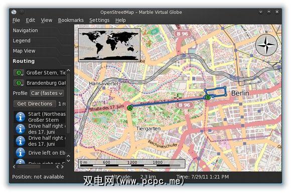 最后,在 Routing 类别中,您可以选择让大理石为您提供行车路线。进入OpenStreetMap主题将是最有用的。然后,您可以选择起点和终点位置,大理石将在视觉上创建一条路线供您遵循。您也可以获取文字说明,尽管它们并不总是可用。