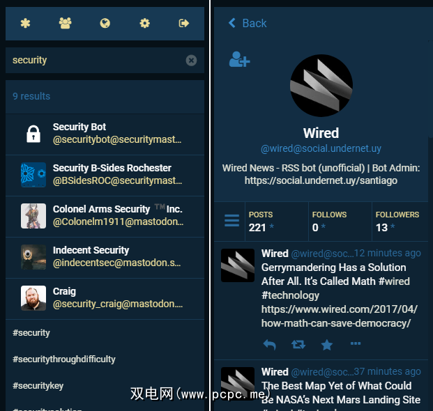一旦您保存更改,单击返回到Mastodon ,然后使用搜索 >字段,以找到讨论您感兴趣的主题的用户。找到某人后,打开其个人资料,然后单击关注按钮。