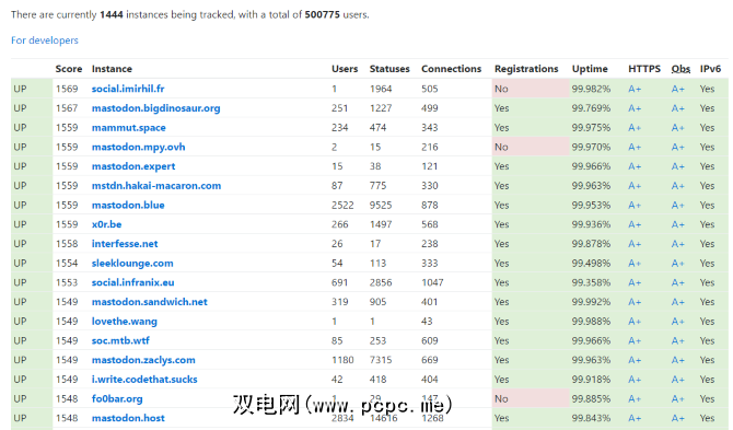 大约有1,400个Mastodon实例。您可以在instances.mastodon.xyz上查看完整列表,您一定会在其中找到要加入的列表。在这里,您将看到每个服务器的状态,该服务器联机的频率,它们是否接受注册,使用HTTPS(使用Web的安全方法)以及许多其他功能。