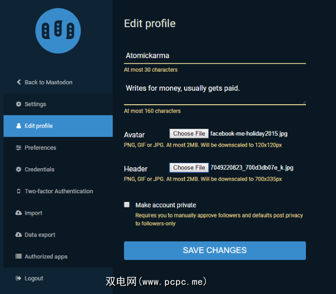 在发送Toot之前,您应该做的第一件事就是单击首选项。在此处,设置您的头像图像,首选用户名和个人资料。您可以在编辑个人资料中执行此操作。 “个人资料"列中还有一个链接。