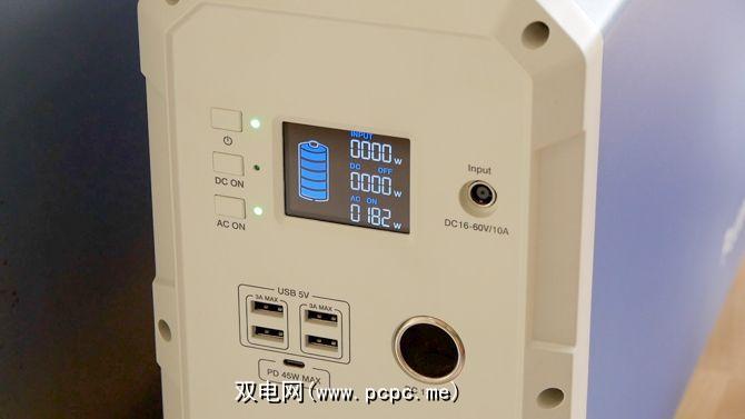 在设备的正面,您会找到电源按钮,DC输出和输入端口,以及小的LCD显示屏。这会显示输入,交流输出和直流输出的确切数字,但只会在五段图中显示剩余容量。