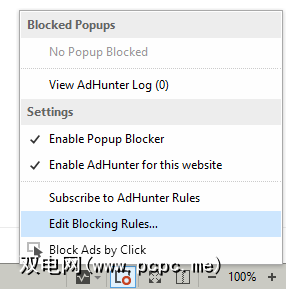 Ad Hunter 是Maxthon用来阻止讨厌的广告和弹出窗口的集成解决方案。请注意,并非所有广告都被Ad Hunter阻止(我完全支持),但是您会获得一个点击选项,可以将规则添加到已阻止广告列表中。