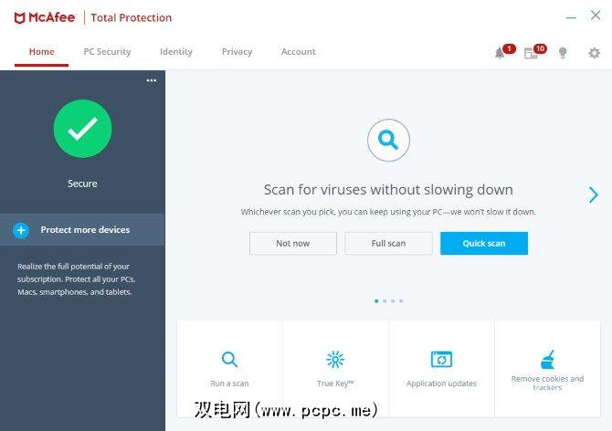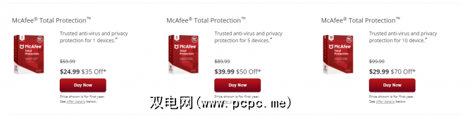 McAfee Total Protection可在一台设备中使用。 ,五台设备和十台设备的计划。在撰写本文时,第一年每个计划的价格分别为每年24.99美元,39.99美元和29.99美元(没有错,这是10个设备的折扣价)。