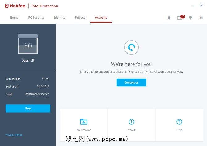 最后一个选项卡使您可以访问McAfee帐户的一些功能。点击左侧的购买,将您的试用版扩展为完整订阅。您也可以点击我的帐户在网络上打开您的帐户页面。 帮助允许访问一些有关软件使用的指南以及McAfee支持的联系选项。