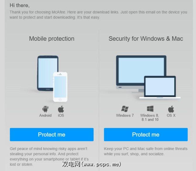 要安装在iPhone或Android手机上的McAfee上,在使用电子邮件地址注册时从McAfee收到的电子邮件中,单击移动保护下的保护我链接。如果没有收到,请点击首页标签上的保护更多设备,然后可以在此处输入电子邮件。