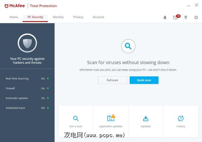 在底部,您将看到与以下相同的运行扫描和应用程序更新工具在首页标签上。还有一个更新选项,可用于检查McAfee软件的更新。 历史记录选项提供了McAfee活动的日志。