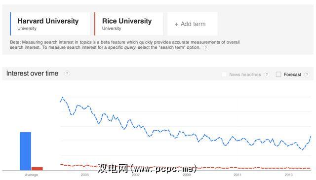 现在,如果您键入“大米"(例如莱斯大学)来衡量相对于哈佛大学的趋势,那么Google会自动预测莱斯大学,这样您就可以进行更公平的比较,而不必用类似于“大米"的任何东西扭曲结果了。