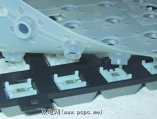 在典型的现代键盘上,按键由橡胶圆顶膜支撑,该圆顶膜位于按键下方。橡胶弹片自然可以抵抗任何压下它的尝试,从而使琴键返回其原始位置。当充分按下一个键时,两个接触点会聚在一起,并被记录为击键。