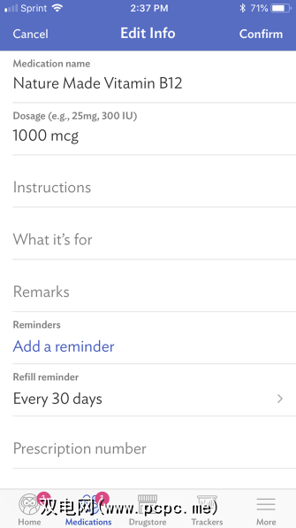 添加药物或补品的名称以及剂量,形式,途径,和单位。您可以包括副作用,数量,处方编号,药房,医师和便笺以获取详细记录。
