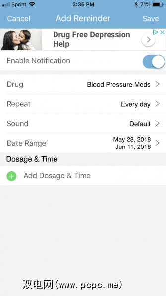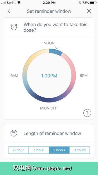 下一步,设置提醒窗口,以便在一定时间范围内服药。然后,选择剂量的频率和数量。