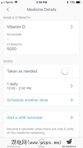 添加药物和补品很简单。弹出您的数量,频率和提醒时间,一切就绪。该应用程序会向您的手腕发送提醒,甚至可以让您知道何时需要补充笔芯。
