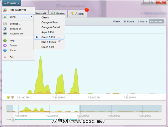 GlassWire的默认视图以图形方式显示您的计算机上载和下载活动。从过去的几分钟到过去一周的趋势,您可以在各种范围内看到它。