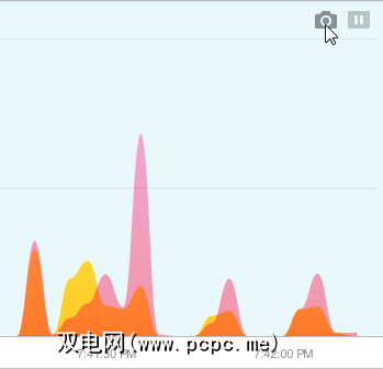 想进一步查看GlassWire的图形密切?当您将鼠标悬停在图形上方时,会出现一个方便的“暂停"按钮,甚至是一个小的摄像头“快照"按钮。