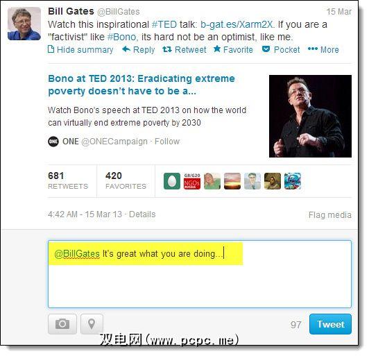 在Twitter上关注此人,并查看其推文。通常,您可以通过某人参与其推文和关注者来确定真正的交易。比尔·盖茨是一个很好的例子,众所周知,他会回信他的追随者(不算假的比尔·盖茨骗局电子邮件)。如果您正在关注他,并且很可能他没有关注您,则除非他关注您,否则您无法在Twitter上直接向他发送消息(DM)。但是您可以通过使用其Twitter名称并在其前面添加@符号来吸引他们的注意。这是一条公开消息,每个人都可以阅读。