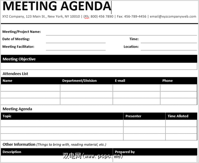 这里还有一个模板可以使您清楚而清晰地看到。像所示的第一个一样,它具有基本的表格式,并带有易于阅读的部分。另外,它还为与会者提供了应带给会议的区域。