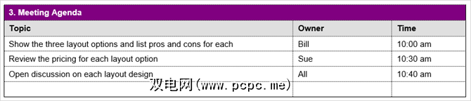 在Bill的例子中,您很清楚议程主题,这很完美。但是,为确保他带来每种布局的优缺点列表以及这些布局的图片,请将其添加到议程的适当部分。
