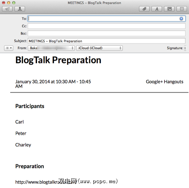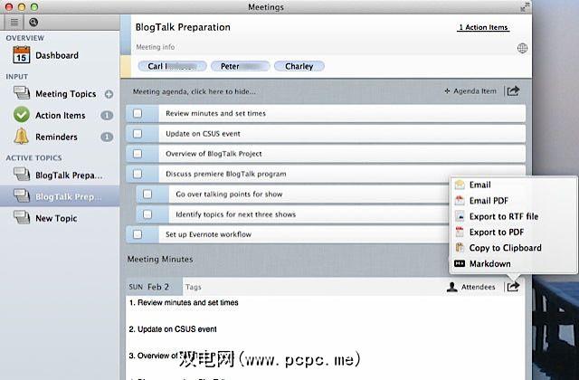 与议程项目一样,会议记录可以通过电子邮件发送,导出为PDF或RTF,复制到剪贴板或设置为Markdown HTML格式。通过电子邮件发送议程或会议记录时,Meetings会自动插入电子邮件地址以及会议内容。这是下面介绍的应用程序所缺少的功能。
