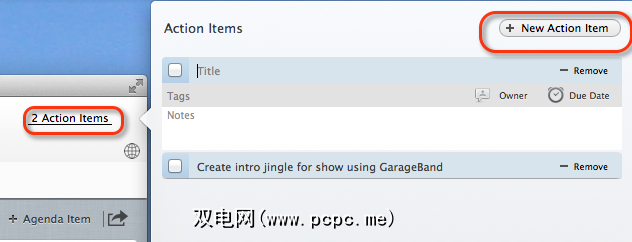 单击小的“ +议程项目"按钮添加会议的第一个议程项目。尽管您也可以使用Shift + Command + G键盘快捷键添加新项目,但如果用户可以按Shift + Return组合键快速键入议程项目,则效果会更好。