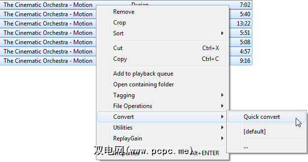 在开始转换之前,您将需要下载最流行格式的其他编码器:AAC,FLAC,MP3和AIFF等。下载并安装编码器后,打开Foobar并找到要转换的音乐。转换功能适用于单个曲目或整个播放列表,因此您可以在这里选择。右键单击音乐曲目,然后选择应该已添加到上下文菜单的转换。