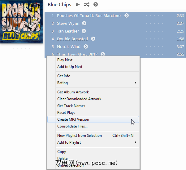 选择要转换的曲目,然后单击鼠标右键。选择创建MP3版本以开始转换您的选择。您最终将获得每个音轨的两个副本,因此您可以决定哪种格式可以为您提供所需的音质。