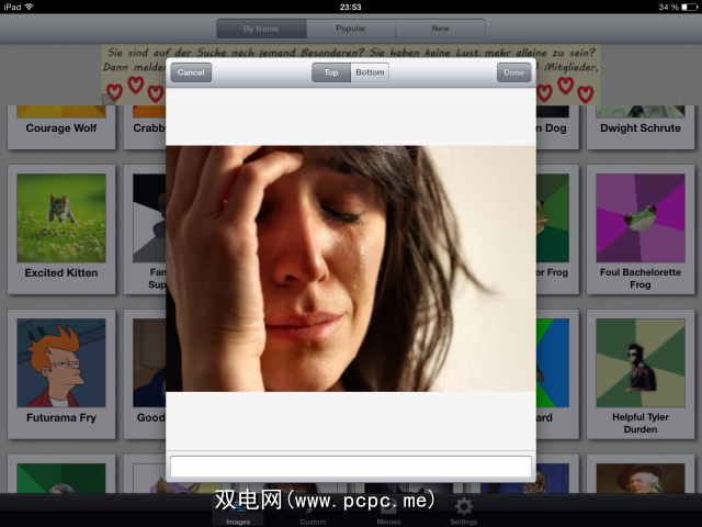 在继续进行之前,我应该指出底部有一个名为“ custom "的选项。这使您可以使用iOS相机拍摄自己的照片,或从iOS相机胶卷中选择照片。如果您的照片真的很有趣并且具有很大的幽默潜力,则可以将其上传到应用程序并将其转换为模因。