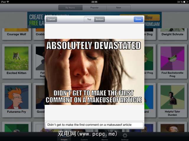 所以,现在是时候制作第一个模因来弄湿你的脚了。只需滚动可用的选项,当您找到想要添加模因的图片时,只需轻按它,它将出现在屏幕上。正如每个图片下方的文字所描述的那样,该短语确实与模因的起源确实有所帮助。