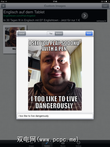 如您所见,顶部是 Top / Bottom 选项。模因中的文字位于顶部和底部。打孔线的引导线位于顶部,而实际打孔线则位于底部。您只需点击该选项,即可在顶部和底部之间切换。底部是文本框。在其中轻按即可启动iOS键盘。