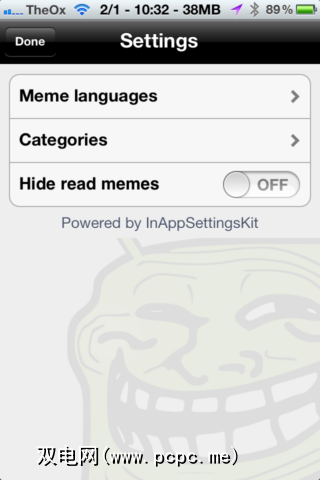 “设置"屏幕可让您控制看到的模因和语言。您也可以制作它,以便该应用程序自动隐藏您以前见过的所有模因,因此每次启动该应用程序时都会感觉是全新的。