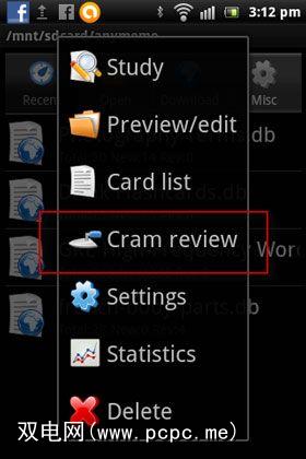 如果您想在考试前快速通过概念,请使用“补习模式"进行自我测试。要启动补习模式,只需在 Recent 列表中长按数据库,然后选择 Cram review 。