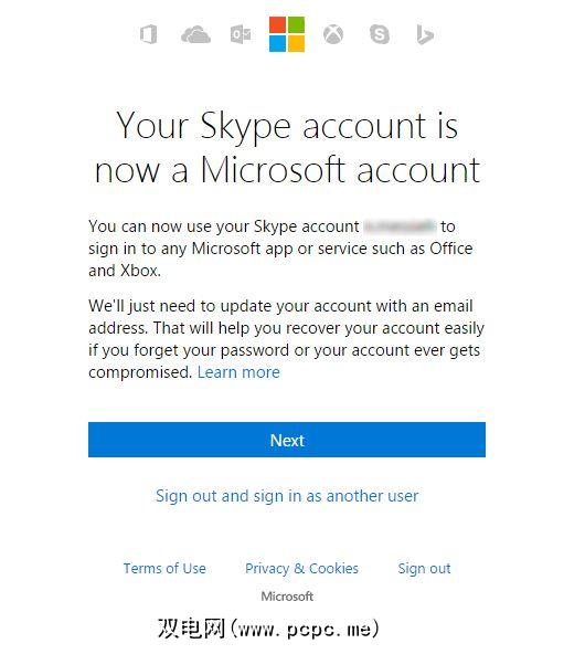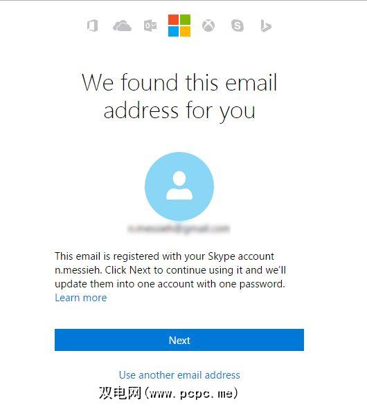 Microsoft将建议与您的Skype帐户关联的电子邮件地址。要使用该地址,请点击下一步按钮。或者,您可以根据需要添加新的电子邮件地址。
