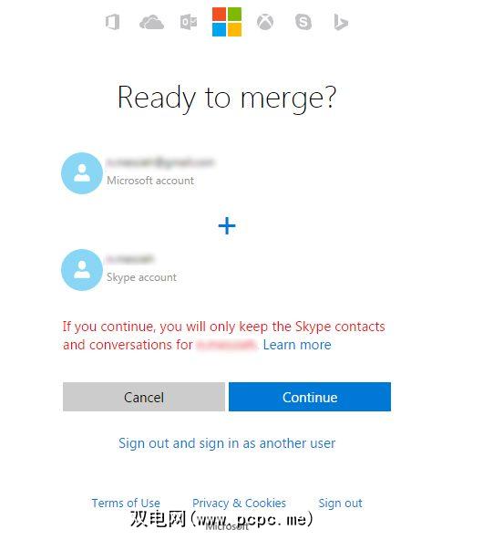 如果您还没有Microsoft帐户,则只需验证备用电子邮件地址,您的Skype帐户就会被更新。到Microsoft帐户。如果您已经有一个Microsoft帐户,系统将提示您输入Microsoft帐户密码,然后您可以继续并确认要合并这两个帐户。