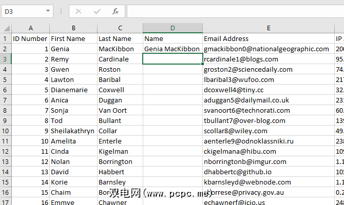 =CONCATENATE(text 1, [text 2],...)该函数接受多个文本输入,并创建一个将所有文本合并的新单元格。这使您可以合并单元而不会丢失任何数据。让我们使用与以前相同的电子表格以及名字和姓氏列表。我们将创建一个新列并使用CONCATENATE来输入名字和姓氏,而不是合并单元格并丢失姓氏。