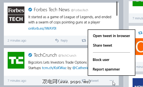 对于时间轴上的每条推文,您都可以选择答复,重新推文(旧方法和新方法)以及一些其他选项,例如阻止并共享。