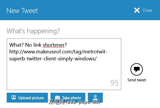 MetroTwit for Windows 8包含您的所有Twitter基本功能,但缺少一些桌面版本中提供的功能。单击底部的鸣叫按钮以撰写鸣叫。这些可能包括来自您的计算机或网络摄像头的图像,以及您当前的位置。它们无法包含的是缩短的链接,因为Windows 8的MetroTwit不提供任何bit.ly集成或链接缩短。当您发布链接时,它只会截断它。