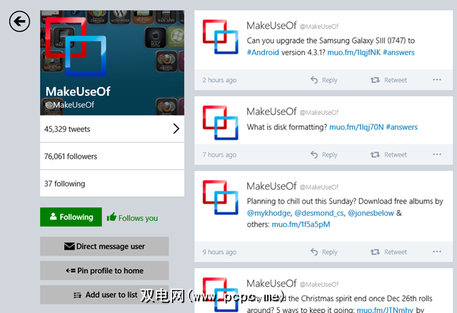 查看单个用户时,您可以查看常规内容例如推文和关注者,关注或取消关注用户,并将用户添加到列表中。 MetroTwit for Windows 8支持列出了一个要点。您可以将用户添加到列表中,但不能通过该应用创建新列表。对于许多Twitter客户来说,这是很普通的事情。