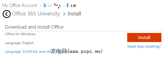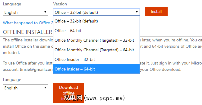 单击安装Office 选项,将打开一个新标签,并且Microsoft Office联机安装程序将开始下载。请注意,这将使用默认设置安装Microsoft Office。您可以通过单击语言,32/64位和其他安装选项链接来更改默认语言和版本。