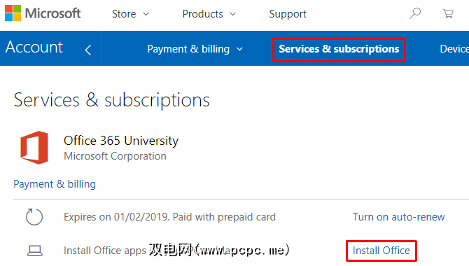 要下载Microsoft Office,请在login.live.com上登录您的帐户。在顶部的蓝色帐户菜单中,选择服务和订阅。在下一页上,您应该看到Microsoft Office的版本,订阅的到期日期以及安装Office 的选项。