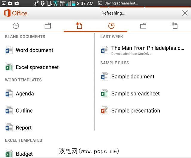 首次启动Office for Android时[否更长],让您印象深刻的第一件事是它的美观。界面干净,开放且易于浏览。那里有很多空白,而且界面遵循Android设计指南的三通,同时仍然唤起了吸引人的现代Metro风格-它看起来与该应用的Windows Phone版本非常相似。该应用程序分为三个可滑动标签页:一个是近期文档列表,您的云存储以及一个带有各种文档模板的标签页。