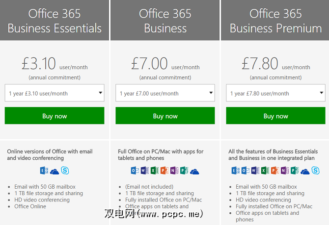 您有三个选择:Office 365商业必备版,Office 365商业版和Office 365商业高级版。