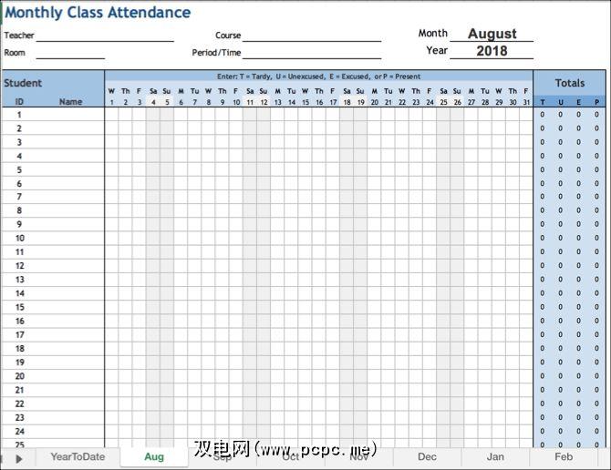 准备好使用谁的出勤表模板来跟踪谁出现在班上,谁不在。这个Excel版本非常有用,因为它每个月都有一个选项卡。然后,您会看到一个用于本年度迄今出勤的标签,该标签会自动从其他标签中填充。